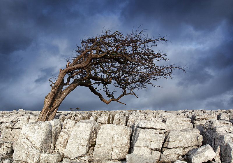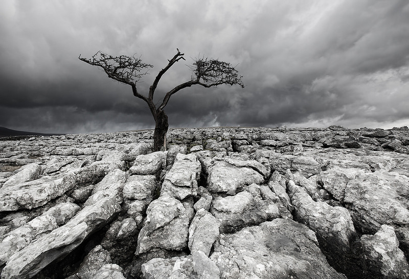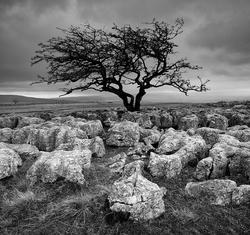 I went up to the Yorkshire Dales and took these images around the limestone pavement avove Twisleton Scar End. It was raining for most of the day but I got about an hour between the showers. The first and last images are not quite mono conversions. I left the middle image in colour to keep the contrast between the brightly lit tree and the stormy sky behind – the light lasted for a few minutes before the clouds came back.