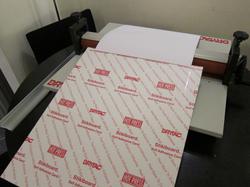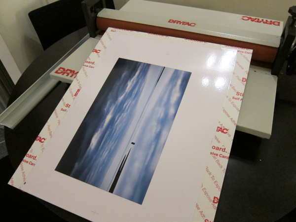 I then made a sandwich of a self adhesive mount board, the print itself, and a piece of laminating film. Lion Framing supply test samples of different films. I started out with the adhesive backing on the film and on the board, but taped the sandwich together along one short edge with masking tape. |